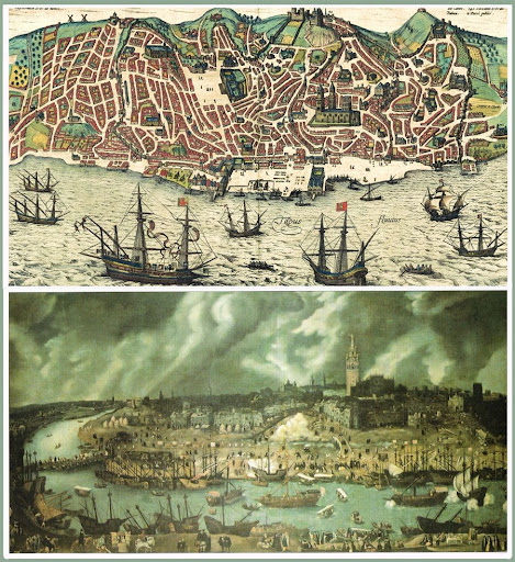 Puertos de Lisboa (arriba) y de Sevilla en el Guadalquivir, en el siglo XVI